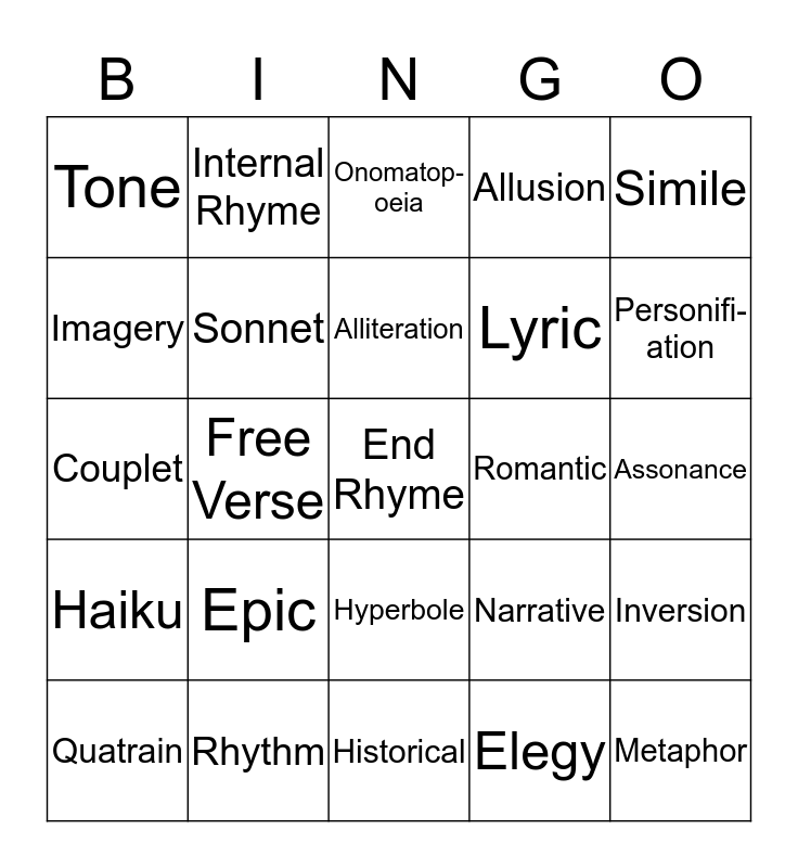 This bingo card has 25 words: Epic, Historical, Alliteration, Quatrain, Simile, Tone, Imagery, Internal Rhyme, Romantic, Hyperbole, Lyric, Couplet, Narrative, Inversion, Sonnet, Metaphor, Assonance, Onomatop-oeia, Personifi- ation, Free Verse, End Rhyme, Rhythm, Haiku, Allusion and Elegy.