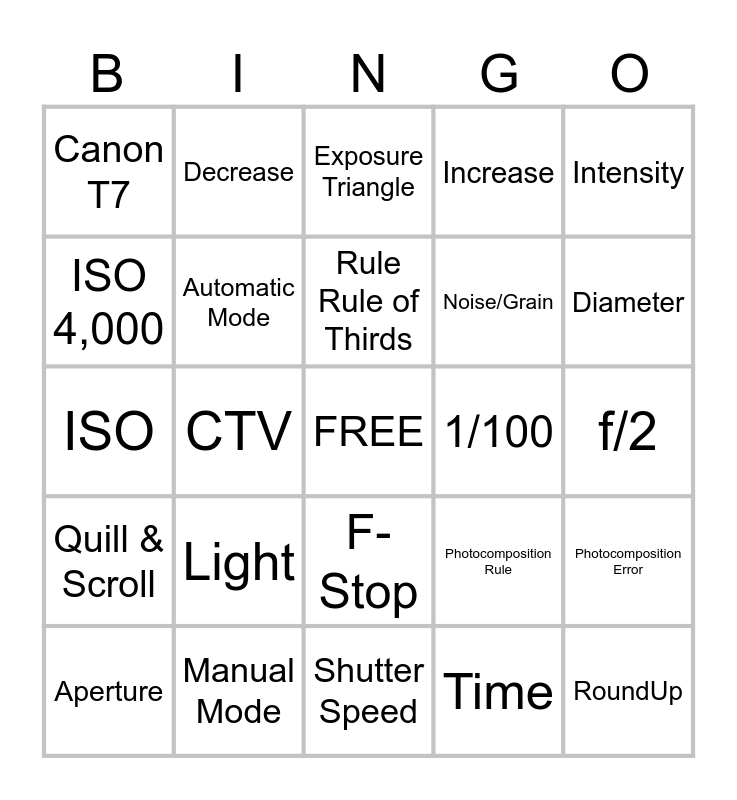 This bingo card has a free space and 29 words: Aperture, Background Blur, CTV, f/22, Canon T7, Exposure Triangle, Automatic Mode, Light, 1/100, Manual Mode, f/2, RoundUp, Shutter Speed, Time, Diameter, ISO 200, F-Stop, Quill & Scroll, Intensity, ISO, Photocomposition Rule, 1/1500, Noise/Grain, ISO 4,000, Increase, Decrease, Photocomposition Error, Rule Rule of Thirds and Leading Lines.