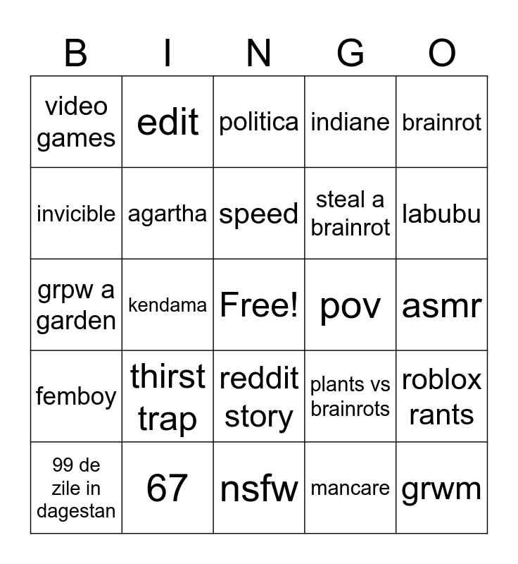 This bingo card has a free space and 24 words: thirst trap, 67, speed, 99 de zile in dagestan, brainrot, video games, invicible, edit, pov, reddit story, steal a brainrot, grpw a garden, plants vs brainrots, roblox rants, agartha, mancare, asmr, politica, labubu, kendama, grwm, femboy, indiane and nsfw.