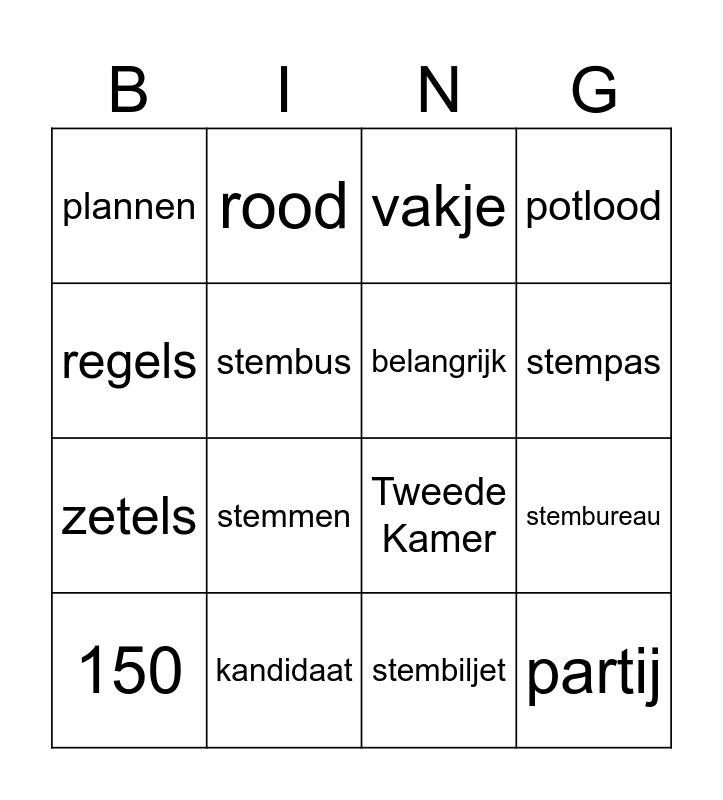 This bingo card has 20 words: stembureau, regering, vakje, minister-president, 150, regels, kandidaat, plannen, zetels, rood, stemmen, Tweede Kamer, stembus, partij, belangrijk, identiteitsbewijs, stempas, potlood, stembiljet and Nederland.