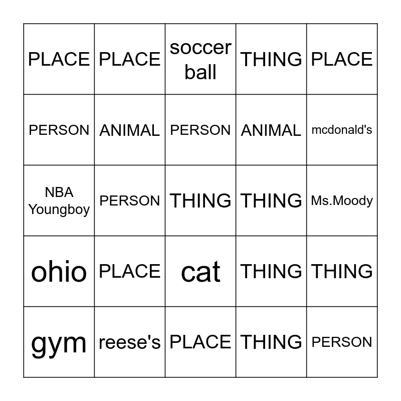 This bingo card has a free space and 50 words: PLACE, PERSON, THING, PLACE, PLACE, ANIMAL, PLACE, THING, PERSON, ANIMAL, ANIMAL, THING, THING, THING, PERSON, PLACE, PERSON, THING, PERSON, PLACE, PERSON, THING, PLACE, ANIMAL, quarterback, president obama, mcdonald's, Jayden, soccer ball, cat, US constitution, 67 Melo Ball, Mr.Reid, King, reese's, concert, Yabniel, ice spice, Burger King, Ms.Moody, Wendy's, lake, Dr. Starnes, YES Academy, gym, NBA Youngboy, dirt bike, boxing gloves, ohio and quarterback, president obama, mcdonald's, Jayden, soccer ball, cat, US constitution, 67 Melo Ball, Mr.Reid, King, reese's, concert, Yabniel, ice spice, Burger King, Ms.Moody, Wendy's, lake, Dr. Starnes, YES Academy, gym, NBA Youngboy, dirt bike,.