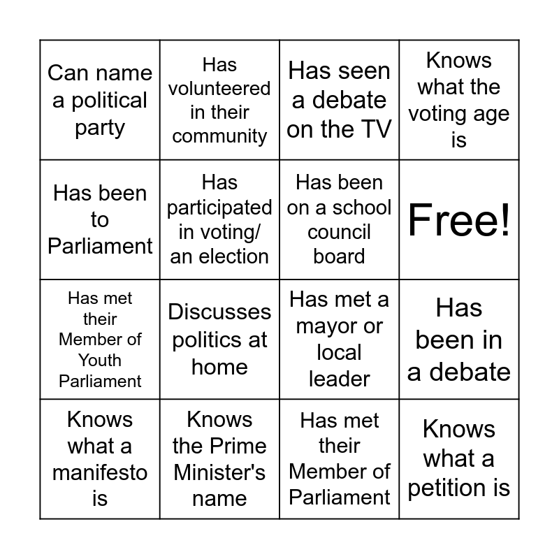 This bingo card has 18 words: Discusses politics at home, Knows what a petition is, Has seen a debate on the TV, Can name a political party, Has met a mayor or local leader, Knows what the voting age is, Knows what a manifesto is, Has volunteered in their community, Free!, Has met their Member of Youth Parliament, Has met their Member of Parliament, Has been to Parliament, Has been in a debate, Has participated in voting/ an election, Has been on a school council board, Knows the definition of democracy, Knows the Prime Minister's name and Knows the role of Kemi Badenoch.