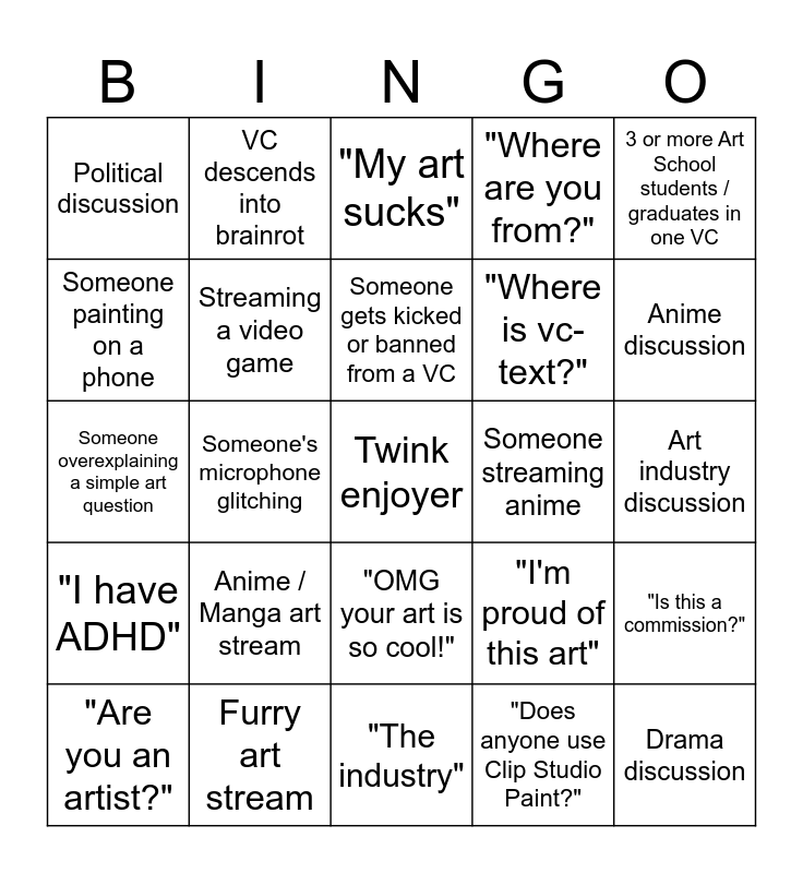 This bingo card has 57 words: Free!, "Are you an artist?", Screaming child, Political discussion, "The industry", "Look at my stream", Streaming a video game, OC / Lore yapping for 3 minutes (must be timed and uninterrupted), "Where is vc-text?", Someone can't stream art because it's NSFW, "Where are you from?", 3 or more german people in one VC, Someone getting ragebaited, Sexist comment, Cat or Dog on a camera, "It's my artstyle", 3 or more Art School students / graduates in one VC, Someone's microphone glitching, Background noise in someone's mic, Twink enjoyer, Someone streaming anime, Traumadumping, "I'm proud of this art", "My art sucks", 3 or more PRO artists in one VC (must have the PRO tag), Someone gets kicked or banned from a VC, Guessing a country from someone's accent, "That is crazy", Anime discussion, Someone streaming a 3D project, Drunk or high person on a VC, at least 2 deafened people in one VC, at least 4 muted people in one VC, AI discussion, Art industry discussion, Someone painting on a phone, 2 V-Tuber avatars in one VC, Someone overexplaining a simple art question, "I have autism", "I have ADHD", VC descends into brainrot, "OMG your art is so cool!", Drama discussion, Traditional artist showing their work, Someone joins and then leaves VC immediately, Pixel art stream, Anime / Manga art stream, Furry art stream, Someone singing, "I'm locked in", Somebody using Photoshop, "Does anyone use Clip Studio Paint?", Someone asks for software help, Someone asks for art help, Someone asks for critique / opinion, "Is this a commission?" and Someone works on a comic / manga.