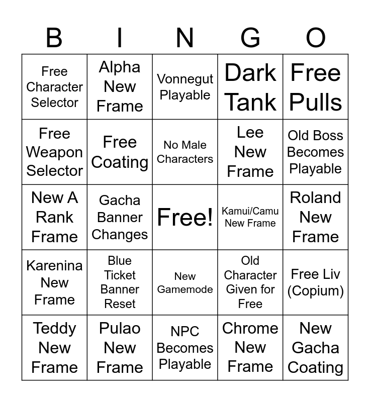This bingo card has a free space and 24 words: Blue Ticket Banner Reset, Pulao New Frame, No Male Characters, Teddy New Frame, Free Pulls, Free Character Selector, Free Weapon Selector, Alpha New Frame, Kamui/Camu New Frame, New Gamemode, Lee New Frame, New A Rank Frame, Old Character Given for Free, Free Liv (Copium), Free Coating, Chrome New Frame, Roland New Frame, Vonnegut Playable, Old Boss Becomes Playable, Gacha Banner Changes, New Gacha Coating, Karenina New Frame, Dark Tank and NPC Becomes Playable.