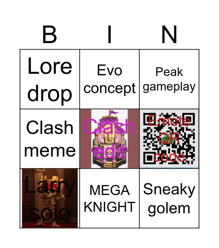 This bingo card has 2 images, a free space and 8 words: Emote QR code, Peak gameplay, Evo concept, Larry solo, Lore drop, Sneaky golem, Clash meme and MEGA KNIGHT.