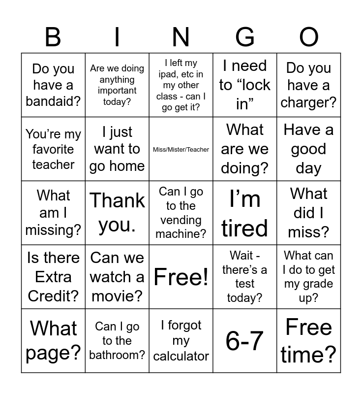 This bingo card has 26 words: Free!, 6-7, Miss/Mister/Teacher, Can I go to the bathroom?, Do you have a charger?, Do you have a bandaid?, You’re my favorite teacher, Are we doing anything important today?, What did I miss?, Wait - there’s a test today?, What are we doing?, What am I missing?, What can I do to get my grade up?, What page?, Thank you., Do you have a pencil?, I need to “lock in”, Is there Extra Credit?, I left my ipad, etc in my other class - can I go get it?, Can I go to the vending machine?, Have a good day, I forgot my calculator, I’m tired, Can we watch a movie?, I just want to go home and Free time?.