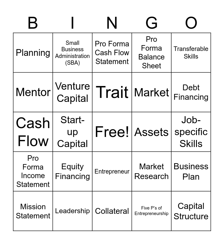 This bingo card has a free space and 26 words: Entrepreneur, Five P’s of Entrepreneurship, Trait, Leadership, Transferable Skills, Planning, Mentor, Small Business Administration (SBA), Job-specific Skills, Market Research, Market, Cash Flow, Business Plan, Mission Statement, Start-up Capital, Pro Forma Financial Statements, Pro Forma Balance Sheet, Pro Forma Income Statement, Pro Forma Cash Flow Statement, Capital Structure, Debt Financing, Collateral, Assets, Equity Financing, Venture Capital and Angel Investors.