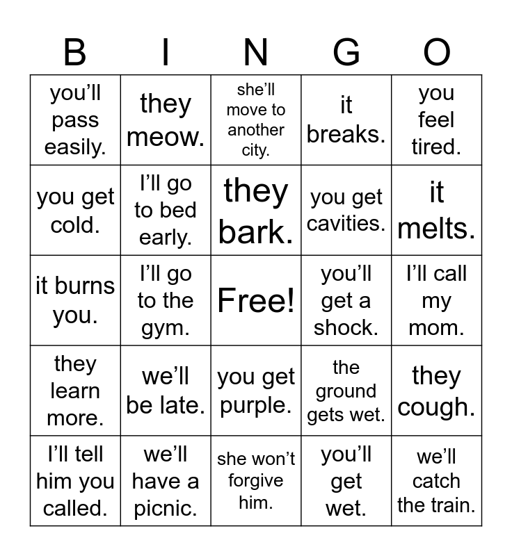 This bingo card has a free space and 29 words: I’ll tell him you called., you’ll miss the bus., I’ll go to the gym., we’ll take sunscreen., you’ll pass easily., she’ll move to another city., I’ll go to bed early., we’ll be late., you’ll get a shock., we’ll have a picnic., I’ll call my mom., we’ll catch the train., she won’t forgive him., you’ll get wet., it melts., they get thirsty., you get purple., they learn more., you feel tired., it burns you., the ground gets wet., the machine starts., you get cavities., you get cold., it breaks., they meow., they cough., they bark. and you can’t see well..
