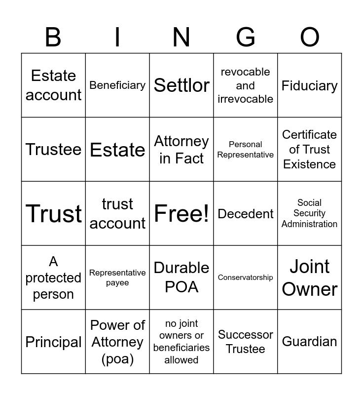 This bingo card has a free space and 24 words: Representative payee, Power of Attorney (poa), Attorney in Fact, Principal, Fiduciary, Estate account, Trustee, Beneficiary, Decedent, Durable POA, Personal Representative, Trust, Conservatorship, Joint Owner, Estate, Successor Trustee, Social Security Administration, Settlor, Certificate of Trust Existence, trust account, Guardian, A protected person, revocable and irrevocable and no joint owners or beneficiaries allowed.