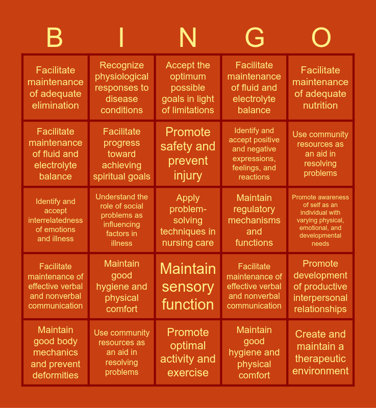 This bingo card has 25 words: Maintain good hygiene and physical comfort, Promote optimal activity and exercise, Promote safety and prevent injury, Maintain good body mechanics and prevent deformities, Facilitate maintenance of adequate nutrition, Facilitate maintenance of adequate elimination, Facilitate maintenance of fluid and electrolyte balance, Recognize physiological responses to disease conditions, Maintain regulatory mechanisms and functions, Maintain sensory function, Identify and accept positive and negative expressions, feelings, and reactions, Identify and accept interrelatedness of emotions and illness, Facilitate maintenance of effective verbal and nonverbal communication, Promote development of productive interpersonal relationships, Facilitate progress toward achieving spiritual goals, Create and maintain a therapeutic environment, Promote awareness of self as an individual with varying physical, emotional, and developmental needs, Accept the optimum possible goals in light of limitations, Use community resources as an aid in resolving problems, Understand the role of social problems as influencing factors in illness, Apply problem-solving techniques in nursing care, Use community resources as an aid in resolving problems, Facilitate maintenance of effective verbal and nonverbal communication, Facilitate maintenance of fluid and electrolyte balance and Maintain good hygiene and physical comfort.