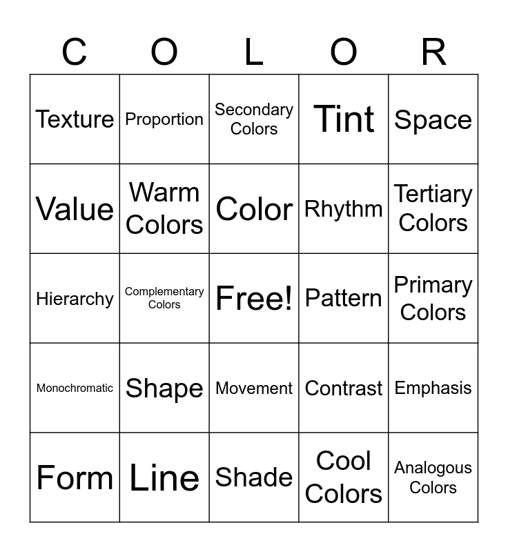 This bingo card has a free space and 24 words: Shape, Line, Color, Form, Space, Texture, Value, Proportion, Pattern, Movement, Rhythm, Hierarchy, Contrast, Emphasis, Warm Colors, Cool Colors, Primary Colors, Secondary Colors, Tertiary Colors, Complementary Colors, Analogous Colors, Monochromatic, Tint and Shade.