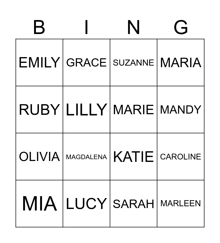 This bingo card has 16 words: LUCY, CAROLINE, SUZANNE, EMILY, OLIVIA, GRACE, KATIE, SARAH, RUBY, LILLY, MIA, MARIA, MAGDALENA, MANDY, MARIE and MARLEEN.