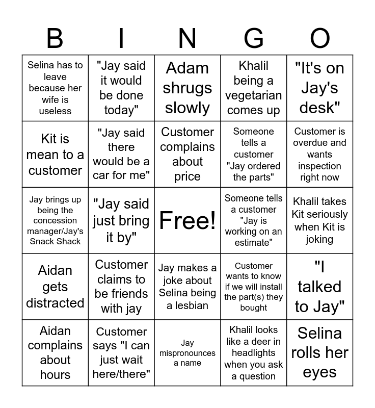 This bingo card has a free space and 28 words: "I talked to Jay", Aidan says "know what I'm saying", Someone tells a customer "Jay ordered the parts", Khalil looks like a deer in headlights when you ask a question, Kit is mean to a customer, Adam shrugs slowly, "Jay said it would be done today", Aidan gets distracted, Someone tells a customer "Jay is working on an estimate", Aidan complains about hours, Jay brings up being the concession manager/Jay's Snack Shack, Khalil being a vegetarian comes up, Customer says "I can just wait here/there", Jay mispronounces a name, Customer is overdue and wants inspection right now, Kit is mean to an employee, Customer claims to be friends with jay, "Jay said there would be a car for me", Customer complains about price, Jay makes a joke about Selina being a lesbian, Selina has to leave because her wife is useless, Wade says "I don't wanna work on anything if I'm being honest", Selina rolls her eyes, "Jay said just bring it by", Khalil takes Kit seriously when Kit is joking, Customer wants to know if we will install the part(s) they bought, "It's on Jay's desk" and Customer says "Oh, and one more thing" when dropping off.