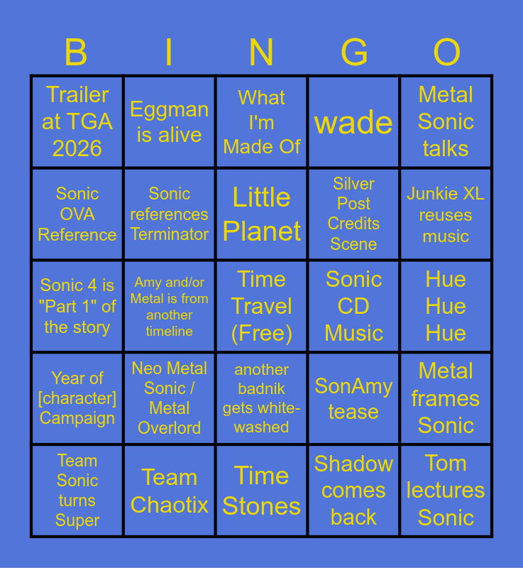 This bingo card has a free space and 24 words: Neo Metal Sonic / Metal Overlord, Team Chaotix, Little Planet, Team Sonic turns Super, Metal Sonic talks, Trailer at TGA 2026, Sonic OVA Reference, Eggman is alive, Sonic CD Music, another badnik gets white-washed, Silver Post Credits Scene, Sonic 4 is "Part 1" of the story, SonAmy tease, Metal frames Sonic, Sonic references Terminator, Shadow comes back, Hue Hue Hue, What I'm Made Of, Junkie XL reuses music, Amy and/or Metal is from another timeline, Tom lectures Sonic, Year of [character] Campaign, wade and Time Stones.