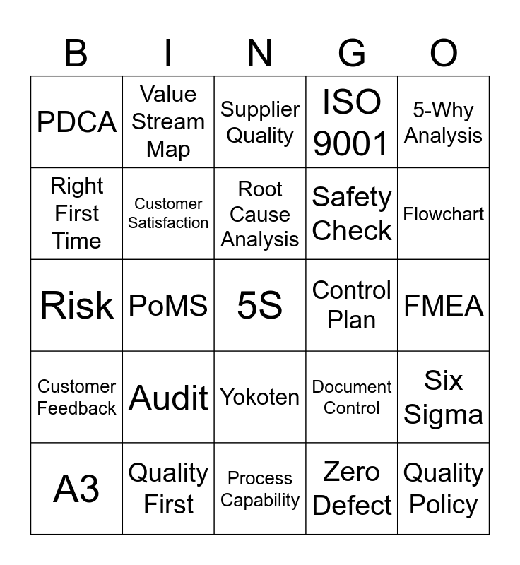 This bingo card has 41 words: Continuous Improvement, Risk, Technical Compliance, Customer Satisfaction, Quality First, Yokoten, Root Cause Analysis, Kaizen, 5-Why Analysis, Customer Feedback, PoMS, ISO 9001, 5S, FMEA, Control Plan, Audit, IATF 16949, PDCA, First Pass Yield, Supplier Quality, Six Sigma, Quality Policy, Process Capability, Safety Check, Defect Prevention, Preventive Action, Zero Defect, Ishikawa, Flowchart, Benchmarking, Checksheet, Value Stream Map, A3, 8D Methodology, Document Control, Right First Time, Internal Audit, External Audit, Ownership, Management Review and Traceability.