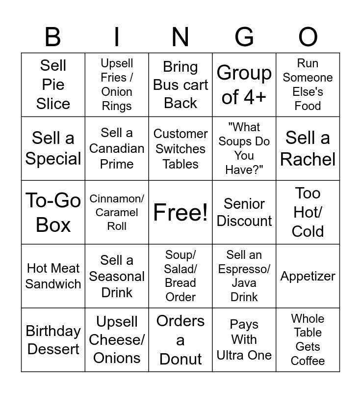 This bingo card has a free space and 24 words: Sell a Seasonal Drink, Upsell Cheese/ Onions, Customer Switches Tables, Birthday Dessert, Run Someone Else's Food, Sell Pie Slice, Sell a Special, Upsell Fries / Onion Rings, Senior Discount, Soup/ Salad/ Bread Order, "What Soups Do You Have?", To-Go Box, Sell an Espresso/ Java Drink, Appetizer, Sell a Canadian Prime, Pays With Ultra One, Too Hot/ Cold, Bring Bus cart Back, Sell a Rachel, Cinnamon/ Caramel Roll, Whole Table Gets Coffee, Hot Meat Sandwich, Group of 4+ and Orders a Donut.