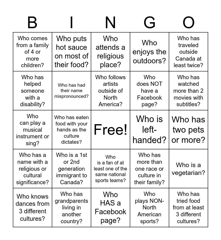 This bingo card has a free space and 24 words: Who is a 1st or 2nd generation immigrant to Canada?, Who has grandparents living in another country?, Who follows artists outside of North America?, Who knows dances from 3 different cultures?, Who has traveled outside Canada at least twice?, Who comes from a family of 4 or more children?, Who has helped someone with a disability?, Who puts hot sauce on most of their food?, Who is left-handed?, Who is a fan of at least one of the same national sports teams?, Who does NOT have a Facebook page?, Who can play a musical instrument or sing?, Who has more than one race or culture in their family?, Who is a vegetarian?, Who has had their name mispronounced?, Who plays NON-North American sports?, Who has two pets or more?, Who attends a religious place?, Who has watched more than 2 movies with subtitles?, Who has eaten food with your hands as the culture dictates?, Who has tried food from at least 3 different cultures?, Who has a name with a religious or cultural significance?, Who enjoys the outdoors? and Who HAS a Facebook page?.