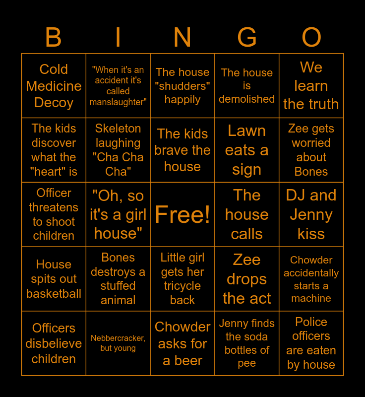 This bingo card has a free space and 29 words: Officers disbelieve children, Nebbercracker smiles, "Oh, so it's a girl house", Haggling for candy sales, Cold Medicine Decoy, The house "shudders" happily, Skeleton laughing "Cha Cha Cha", Bones destroys a stuffed animal, The house calls, Nebbercracker, but young, DJ and Jenny kiss, Police officers are eaten by house, Chowder asks for a beer, Jenny finds the soda bottles of pee, Zee gets worried about Bones, Bones gets eaten by house, Little girl gets her tricycle back, House spits out basketball, We learn the truth, Officer threatens to shoot children, Zee drops the act, A large, plastic tooth, Lawn eats a sign, The kids discover what the "heart" is, The house is demolished, "When it's an accident it's called manslaughter", Chowder accidentally starts a machine, The kids brave the house and The house has "teeth".