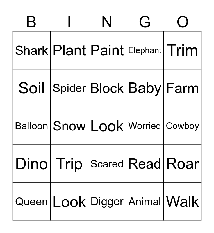 This bingo card has a free space and 120 words: Dark, School, Lunch, Bus, Rabbit, Write, Elephant, Finger, Roar, Belt, Hop, Shaker, Iguana, Play, Slide, Towel, Scared, Car, Race, Ear, Queen, Paint, Skip, Build, Roll, Dino, Look, Cut, Cook, Hang, Animal, Snow, Block, Bike, Crying, Boo, Hurt, Doctor, Jellyfish, Party, Down, Hoop, Feeling, Finish, Tug, Jobs, Sick, Worried, Kick, Fire, Bake, Swim, Read, Scoop, Splash, Silly, Train, Give, King, Plant, Zoo, Lick, Brave, Chick, Sleep, Soil, Face, Car, Color, Karate, Balloon, House, Carrot, Drive, Shut, Wash, Baby, Teddy, Walk, Trip, Shark, Cream, Ride, Snorkel, Bend, Shape, Digger, Bath, Work, Police, Empty, Cowboy, Scoot, Round, Hero, Ball, Duck, Trim, Curious, Airplane, Hike, Buzz, Fish, Stop, Popcorn, Spider, Bridge, Climb, Kennel, Pool, Garden, Horse, Star, Cough, Farm, Deep, Shop, Brush, Tent and Gate.