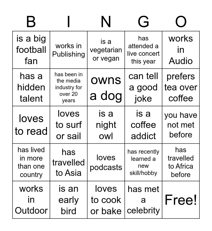 This bingo card has 33 words: Free!, has run a half marathon, loves to surf or sail, speaks more than two languages, has lived in more than one country, has been in the media industry for over 20 years, works in Audio, works in Outdoor, works in Publishing, works in a Support Function, owns a dog, is a vegetarian or vegan, has three or more children, plays an instrument or sings, is a coffee addict, prefers tea over coffee, is an early bird, loves to read, has travelled to Asia, has recently learned a new skill/hobby, loves podcasts, has recently joined BMG, is a big football fan, you have not met before, loves to cook or bake, is a night owl, has attended a live concert this year, can tell a good joke, has a hidden talent, has travelled to Africa before, loves cycling, has met a celebrity and owns a cat.