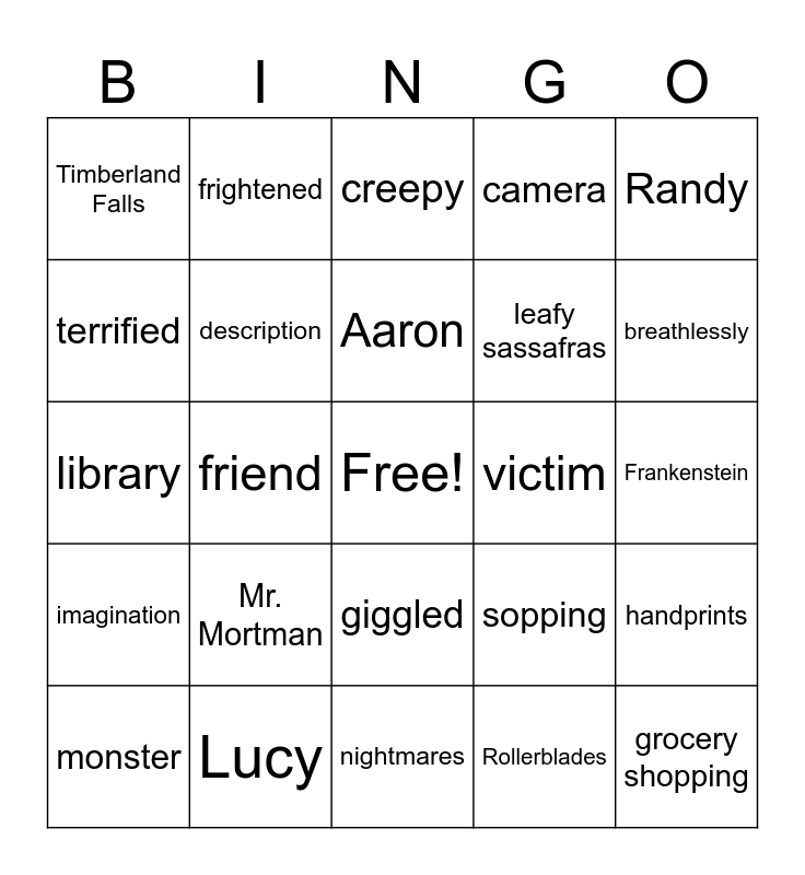 This bingo card has a free space and 24 words: Mr. Mortman, Lucy, Aaron, monster, Randy, Timberland Falls, terrified, frightened, victim, giggled, leafy sassafras, library, sopping, handprints, description, Rollerblades, Frankenstein, creepy, breathlessly, friend, grocery shopping, imagination, camera and nightmares.