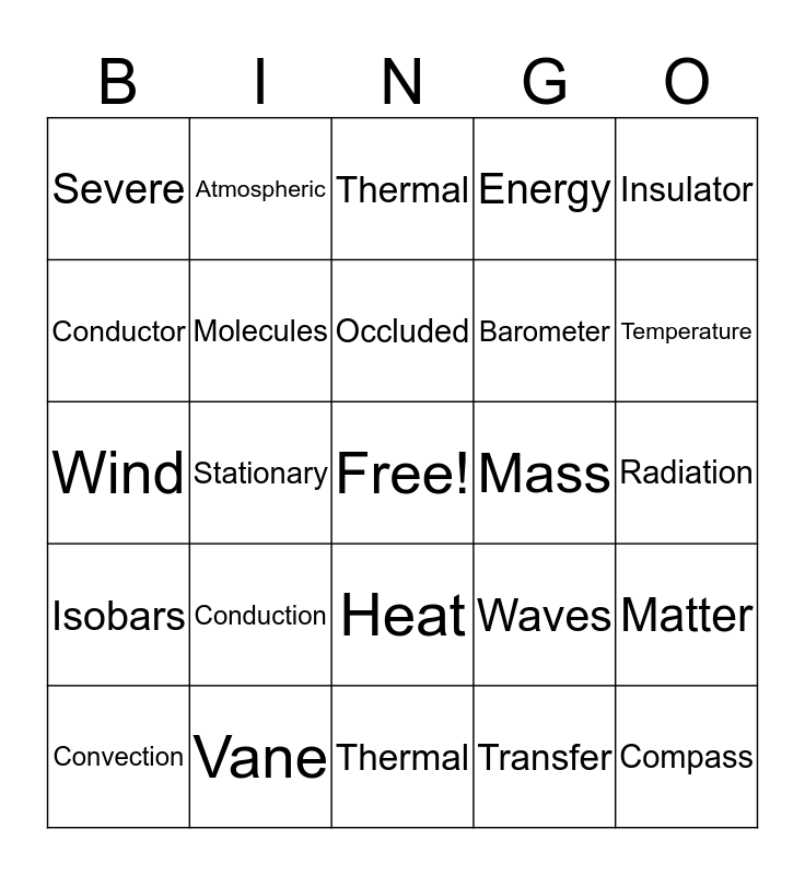 This bingo card has a free space and 24 words: Conduction, Vane, Occluded, Convection, Insulator, Severe, Conductor, Atmospheric, Mass, Heat, Barometer, Wind, Waves, Matter, Molecules, Transfer, Radiation, Thermal, Temperature, Stationary, Compass, Isobars, Energy and Thermal.
