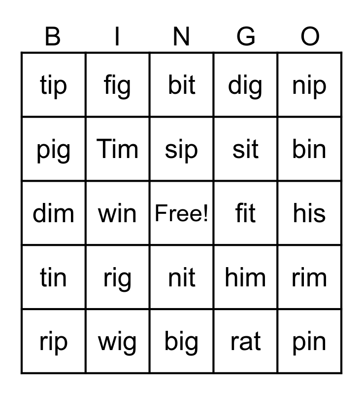 This bingo card has a free space and 24 words: rig, wig, sip, rip, nip, tip, pig, fig, fit, nit, sit, dim, him, rim, Tim, rat, his, bit, bin, win, pin, tin, dig and big.