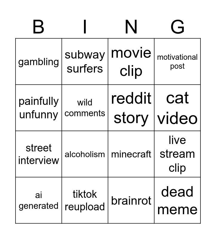 This bingo card has 16 words: tiktok reupload, live stream clip, movie clip, gambling, street interview, subway surfers, minecraft, brainrot, painfully unfunny, wild comments, ai generated, motivational post, alcoholism, cat video, reddit story and dead meme.