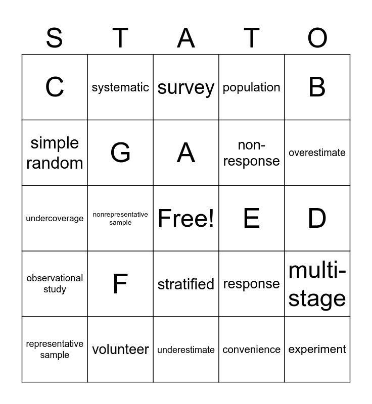 This bingo card has a free space and 26 words: stratified, convenience, A, volunteer, B, C, simple random, systematic, D, response, non-response, undercoverage, multi-stage, representative sample, nonrepresentative sample, sample, population, observational study, survey, experiment, overestimate, underestimate, E, F, G and H.