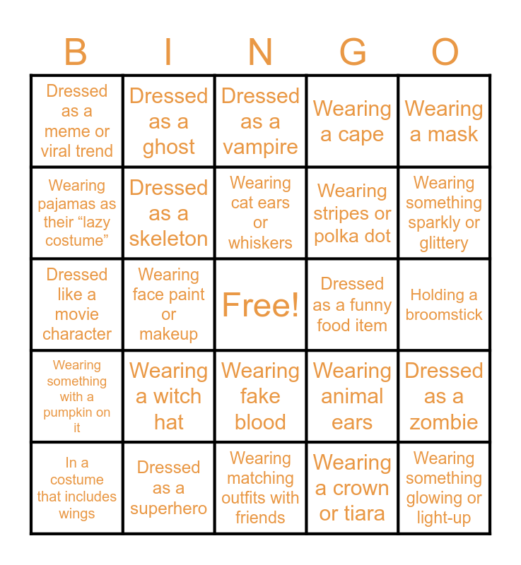 This bingo card has a free space and 24 words: Wearing a witch hat, Dressed as a superhero, Wearing cat ears or whiskers, In a costume that includes wings, Wearing a mask, Dressed as a meme or viral trend, Wearing pajamas as their “lazy costume”, Dressed as a ghost, Dressed as a funny food item, Wearing fake blood, Wearing stripes or polka dot, Dressed like a movie character, Wearing animal ears, Dressed as a zombie, Dressed as a skeleton, Wearing a crown or tiara, Holding a broomstick, Dressed as a vampire, Wearing something sparkly or glittery, Wearing face paint or makeup, Wearing something glowing or light-up, Wearing something with a pumpkin on it, Wearing a cape and Wearing matching outfits with friends.