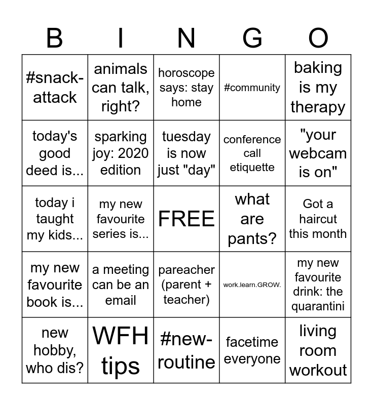 This bingo card has a free space and 39 words: "sorry, i was on mute", #wereinthistogether, speed walking is my cardio, sparking joy: 2020 edition, new hobby, who dis?, pareacher (parent + teacher), tuesday is now just "day", "can you hear me?", baking is my therapy, my new favourite book is..., my new favourite series is..., #community, living room workout, Got a haircut this month, what are pants?, a meeting can be an email, chocolate is a food group, #snack-attack, long hair, don't care, work.learn.GROW., today's good deed is..., #new-routine, conference call etiquette, "your webcam is on", my new favourite recipe is..., kitchen table commute, two days, one shirt, start at staples, #oneteam, animals can talk, right?, quarantine strong, coronnials, horoscope says: stay home, WFH tips, facetime everyone, it's called social distancing, my new favourite drink: the quarantini, today i taught my kids... and this week i've cooked....