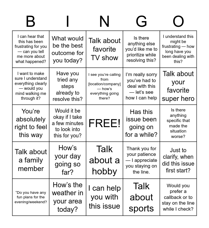 This bingo card has a free space and 24 words: How’s your day going so far?, How’s the weather in your area today?, I see you’re calling from [location/company] — how’s everything going there?, “Do you have any fun plans for the evening/weekend?, I understand this might be frustrating — how long have you been dealing with this?, I can hear that this has been frustrating for you — can you tell me more about what happened?, I want to make sure I understand everything clearly — would you mind walking me through it?, What would be the best outcome for you today?, Has this issue been going on for a while?, Talk about a hobby, I’m really sorry you’ve had to deal with this — let’s see how I can help, You’re absolutely right to feel this way, Thank you for your patience — I appreciate you staying on the line., Just to clarify, when did this issue first start?, Have you tried any steps already to resolve this?, Talk about sports, Is there anything specific that made the situation worse?, Talk about favorite TV show, Talk about your favorite super hero, Would it be okay if I take a few minutes to look into this for you?, Would you prefer a callback or to stay on the line while I check?, Talk about a family member, Is there anything else you’d like me to prioritize while resolving this? and I can help you with this issue.