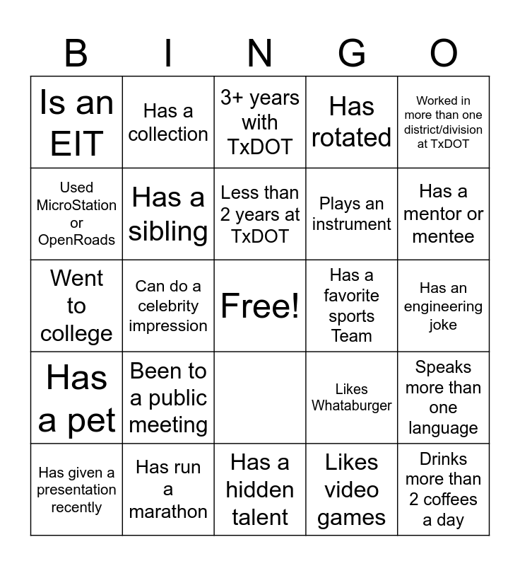 This bingo card has a free space and 26 words: Went to college, Has a hidden talent, Plays an instrument, Drinks more than 2 coffees a day, Is an EIT, Has a collection, 3+ years with TxDOT, Has rotated, Has an engineering joke, Has a pet, Been to a public meeting, Has a favorite sports Team, Speaks more than one language, Has passed PE exam, Less than 2 years at TxDOT, Has been stuck in TxDOT traffic, Worked in more than one district/division at TxDOT, Used MicroStation or OpenRoads, Has a sibling, Likes Whataburger, Has a mentor or mentee, Has given a presentation recently, Has run a marathon, Likes video games, Can do a celebrity impression and Has a Master's degree.