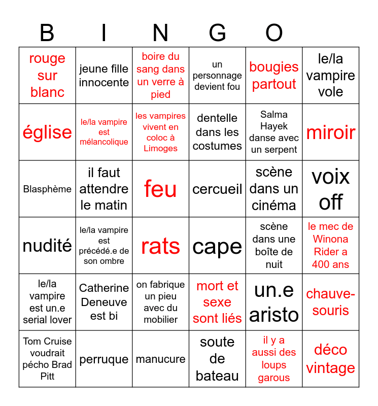 This bingo card has 36 words: mort et sexe sont liés, on fabrique un pieu avec du mobilier, soute de bateau, église, nudité, cercueil, le/la vampire est mélancolique, manucure, bougies partout, un.e aristo, miroir, un personnage devient fou, chauve-souris, il faut attendre le matin, dentelle dans les costumes, rouge sur blanc, le/la vampire est un.e serial lover, scène dans un cinéma, Blasphème, boire du sang dans un verre à pied, feu, le/la vampire est précédé.e de son ombre, cape, rats, scène dans une boîte de nuit, jeune fille innocente, Salma Hayek danse avec un serpent, perruque, les vampires vivent en coloc à Limoges, le/la vampire vole, déco vintage, Tom Cruise voudrait pécho Brad Pitt, le mec de Winona Rider a 400 ans, voix off, Catherine Deneuve est bi and il y a aussi des loups garous.