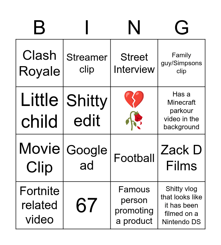 This bingo card has 16 words: 67, Zack D Films, Street Interview, Clash Royale, Movie Clip, Streamer clip, Football, Famous person promoting a product, Little child, Shitty edit, Fortnite related video, Family guy/Simpsons clip, Google ad, Has a Minecraft parkour video in the background, 💔🥀 and Shitty vlog that looks like it has been filmed on a Nintendo DS.