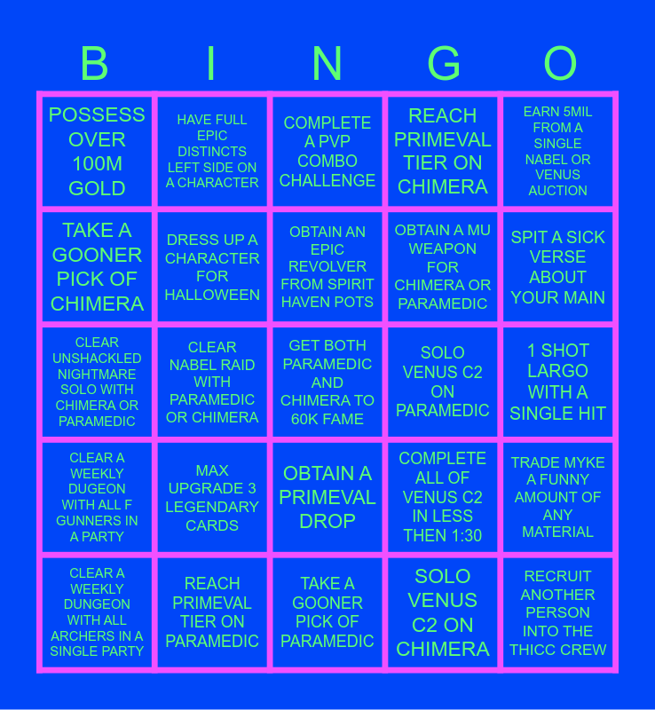 This bingo card has a free space and 24 words: MAX UPGRADE 3 LEGENDARY CARDS, REACH PRIMEVAL TIER ON PARAMEDIC, OBTAIN AN EPIC REVOLVER FROM SPIRIT HAVEN POTS, CLEAR A WEEKLY DUNGEON WITH ALL ARCHERS IN A SINGLE PARTY, EARN 5MIL FROM A SINGLE NABEL OR VENUS AUCTION, POSSESS OVER 100M GOLD, TAKE A GOONER PICK OF CHIMERA, HAVE FULL EPIC DISTINCTS LEFT SIDE ON A CHARACTER, SOLO VENUS C2 ON PARAMEDIC, OBTAIN A PRIMEVAL DROP, OBTAIN A MU WEAPON FOR CHIMERA OR PARAMEDIC, CLEAR UNSHACKLED NIGHTMARE SOLO WITH CHIMERA OR PARAMEDIC, COMPLETE ALL OF VENUS C2 IN LESS THEN 1:30, TRADE MYKE A FUNNY AMOUNT OF ANY MATERIAL, DRESS UP A CHARACTER FOR HALLOWEEN, SOLO VENUS C2 ON CHIMERA, 1 SHOT LARGO WITH A SINGLE HIT, COMPLETE A PVP COMBO CHALLENGE, SPIT A SICK VERSE ABOUT YOUR MAIN, CLEAR NABEL RAID WITH PARAMEDIC OR CHIMERA, RECRUIT ANOTHER PERSON INTO THE THICC CREW, CLEAR A WEEKLY DUGEON WITH ALL F GUNNERS IN A PARTY, REACH PRIMEVAL TIER ON CHIMERA and TAKE A GOONER PICK OF PARAMEDIC.