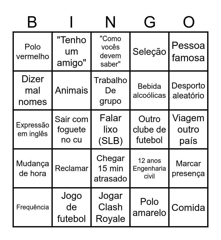 This bingo card has a free space and 31 words: Jogar Clash Royale, Comentário aleatório, Sair com foguete no cu, Boa tarde a todos, Polo vermelho, "Como vocês devem saber", Animais, 12 anos Engenharia civil, Outro clube de futebol, Polo amarelo, Viagem outro país, Comida, Brasil, Olimpíadas, Desporto aleatório, Iscac, Marcar presença, Reclamar, Mudança de hora, Chegar 15 min atrasado, Pessoa famosa, Polo castanho, Frequência, "Tenho um amigo", Bebida alcoólicas, Dizer mal nomes, Seleção, Expressão em inglês, Jogo de futebol, Trabalho De grupo and Polo cinzento.