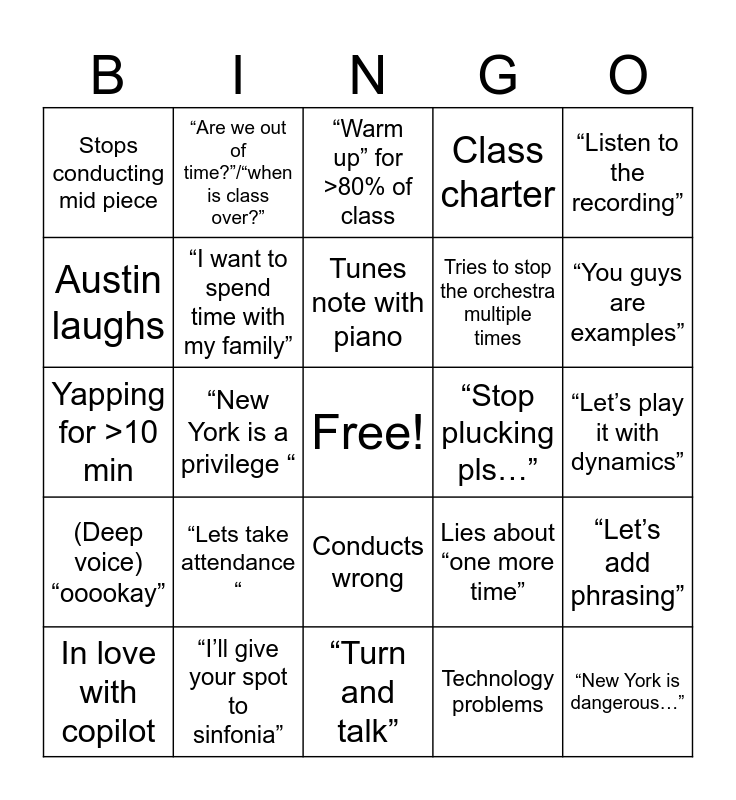 This bingo card has a free space and 28 words: “Let’s add phrasing”, Threatens binder check/“where’s ur pencil”, Tries to stop the orchestra multiple times, Technology problems, Austin laughs, “Warm up” for >80% of class, “Are we out of time?”/“when is class over?”, (Deep voice) “ooookay”, “Stop plucking pls…”, In love with copilot, Yapping for >10 min, Class charter, “I’ll give your spot to sinfonia”, “Turn and talk”, “You guys are examples”, “Did you guys really tune?”, “Lets take attendance “, “I want to spend time with my family”, Tunes note with piano, Conducts wrong, Stops conducting mid piece, Viola joke, “New York is dangerous…”, “New York is a privilege “, “Let’s play it with dynamics”, Lies about “one more time”, “Listen to the recording” and “Look at the score”.