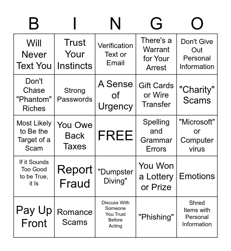 This bingo card has a free space and 24 words: Report Fraud, Romance Scams, A Sense of Urgency, Pay Up Front, Don't Give Out Personal Information, Will Never Text You, Don't Chase "Phantom" Riches, Trust Your Instincts, Spelling and Grammar Errors, "Dumpster Diving", Gift Cards or Wire Transfer, Most Likely to Be the Target of a Scam, You Won a Lottery or Prize, Emotions, Strong Passwords, "Phishing", "Microsoft" or Computer virus, Verification Text or Email, "Charity" Scams, You Owe Back Taxes, Shred Items with Personal Information, If it Sounds Too Good to be True, it Is, There's a Warrant for Your Arrest and Discuss With Someone You Trust Before Acting.