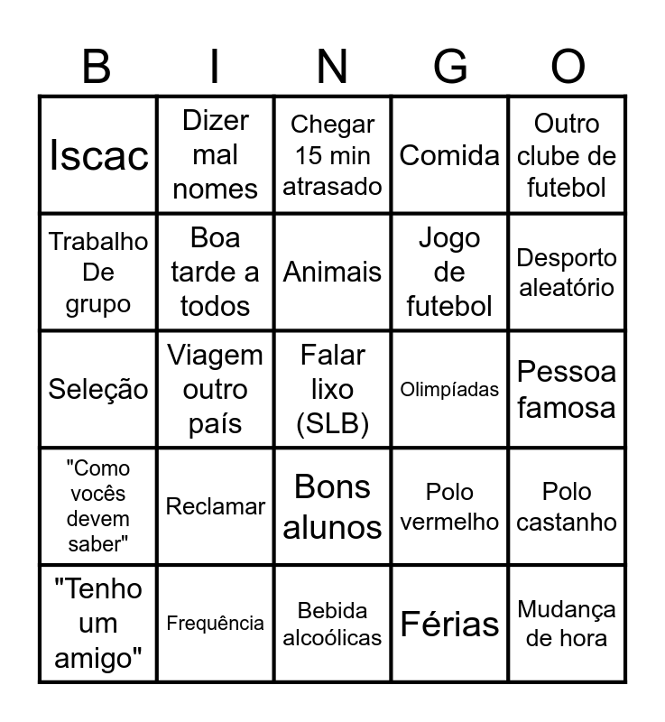 This bingo card has a free space and 36 words: Jogar Clash Royale, Comentário aleatório, Sair com foguete no cu, Boa tarde a todos, Polo vermelho, "Como vocês devem saber", Animais, 12 anos Engenharia civil, Outro clube de futebol, Polo amarelo, Viagem outro país, Comida, Brasil, Olimpíadas, Desporto aleatório, Iscac, Marcar presença, Reclamar, Mudança de hora, Chegar 15 min atrasado, Pessoa famosa, Polo castanho, Frequência, "Tenho um amigo", Bebida alcoólicas, Dizer mal nomes, Seleção, Expressão em inglês, Jogo de futebol, Trabalho De grupo, Polo cinzento, Polo azul, Férias, Bons alunos, Falar da infância and Prémio.
