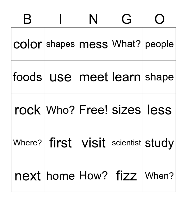 This bingo card has a free space and 24 words: first, home, meet, next, people, color, foods, shapes, sizes, visit, learn, rock, scientist, study, use, fizz, less, mess, shape, Who?, When?, Where?, What? and How?.