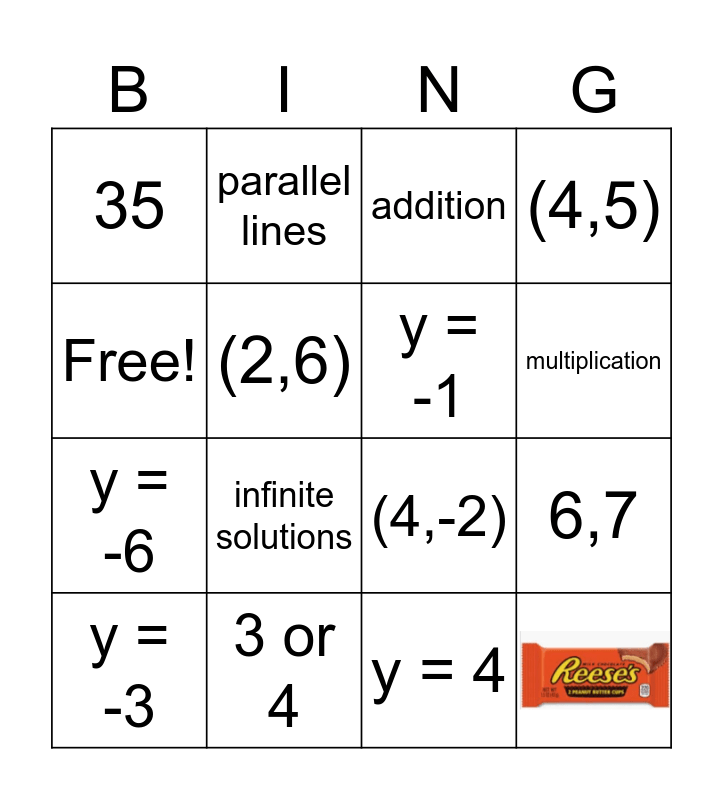 This bingo card has 1 images and 15 words: 3 or 4, 6,7, addition, 35, y = -6, parallel lines, (4,-2), y = 4, Free!, (2,6), y = -3, (4,5), infinite solutions, multiplication and y = -1.