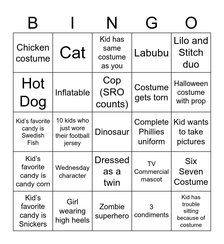 This bingo card has 50 words: Superhero, Dinosaur, Cowboy/Cowgirl, Zombie superhero, Wednesday character, M&M, Cat, Cow, Hot Dog, Pumpkin, Inflatable, Labubu, Six Seven Costume, TV Commercial mascot, Doctor/Nurse, Fireman, Cop (SRO counts), Complete Phillies uniform, Taylor and Travis, Lilo and Stitch duo, 10 kids who just wore their football jersey, 3 condiments, Chicken costume, Costume gets torn, Costume comes with music, Kid has trouble sitting because of costume, Halloween costume with prop, Sweaty kid in onesie, Kid has same costume as you, Dressed as a twin, Boy wearing face paint, Girl wearing face paint, Student with spray painted hair, Student wearing black lipstick, Girl wearing high heels, Student dressed as a nerd, Someone has a flower lei, Kid loves your costume!, Kid gives you candy, Kid wants to take pictures, Kid asks if you have candy, Kid tries to eat candy in class, Kid’s favorite candy is peanut butter cups, Kid’s favorite candy is Gushers, Kid’s favorite candy is Snickers, Kid’s favorite candy is Swedish Fish, Kid’s favorite candy is Skittles, Kid’s favorite candy is M&Ms, Kid’s favorite candy is candy corn and Kid asks why we have school on Halloween.