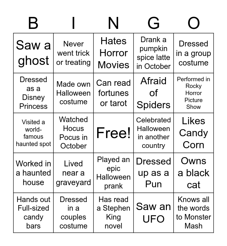 This bingo card has a free space and 34 words: Dressed up Like Batman, Saw an UFO, Owned a black cat, Elaborately decorates house for Halloween, Worked in a haunted house, Made own Halloween costume, Dressed in a group costume, Hands out Full-sized candy bars, Never went trick or treating, Played with an Ouija board, Can read fortunes or tarot, Hates Horror Movies, Has annual scary movie marathon, October birthday, Celebrated Halloween in another country, Performed in Rocky Horror Picture Show, Dressed in a couples costume, Visited a world-famous haunted spot, Lived near a graveyard, Dressed up as a Pun, Played an epic Halloween prank, Halloween is favorite holiday, Saw a ghost, Likes Candy Corn, Has read a Stephen King novel, Knows all the words to Monster Mash, Drank a pumpkin spice latte in October, Listens to true crime podcasts, Afraid of Spiders, Dressed as a Disney Princess, Dressed as Superman, Watched Hocus Pocus in October, Owns a black cat and Dresses their pet in a Halloween costume.