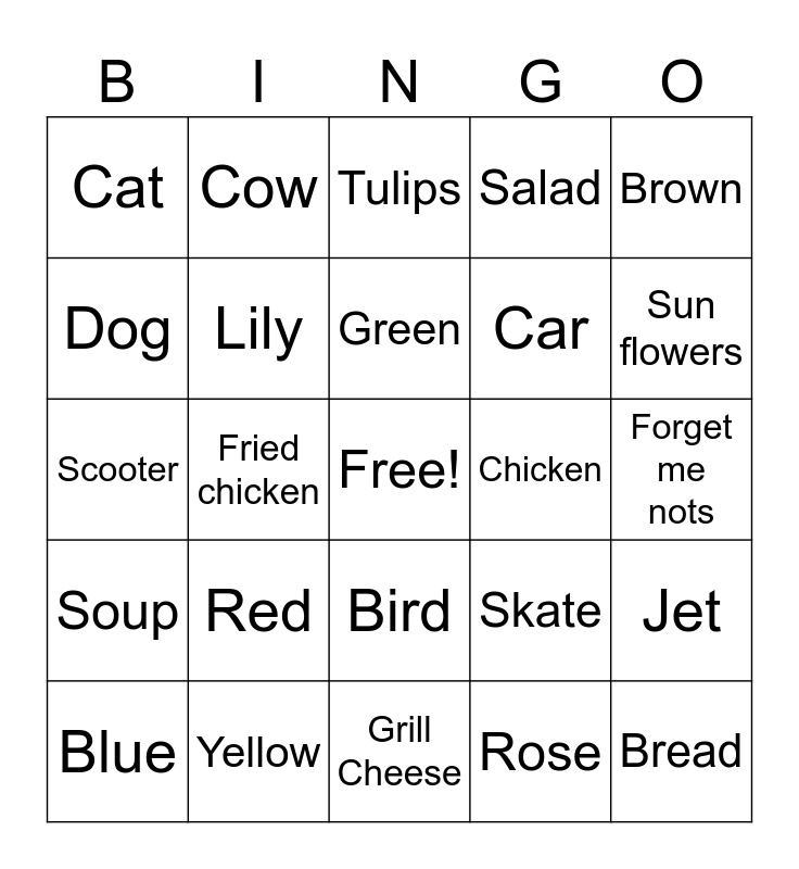 This bingo card has a free space and 24 words: Red, Yellow, Green, Blue, Brown, Cat, Dog, Cow, Chicken, Bird, Car, Scooter, Skate, Jet, Lily, Rose, Forget me nots, Tulips, Sun flowers, Fried chicken, Bread, Soup, Salad and Grill Cheese.