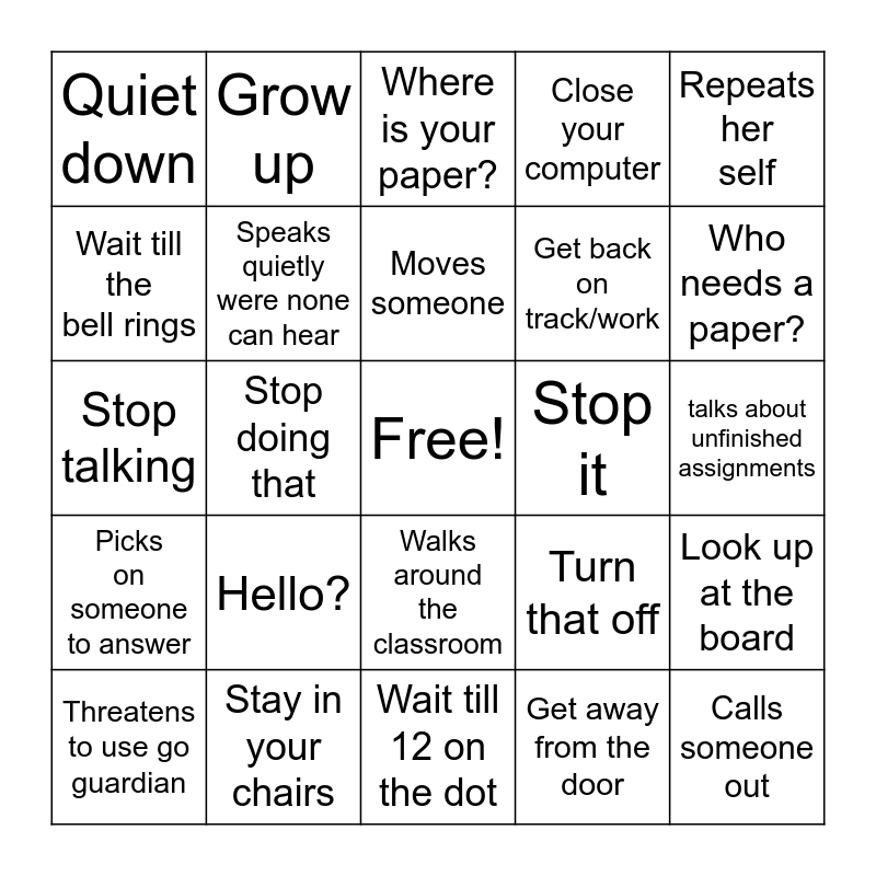 This bingo card has a free space and 24 words: Hello?, Stay in your chairs, Moves someone, Threatens to use go guardian, Repeats her self, Quiet down, Wait till the bell rings, Grow up, Stop it, Walks around the classroom, Get back on track/work, Stop talking, Turn that off, Look up at the board, Speaks quietly were none can hear, Get away from the door, talks about unfinished assignments, Where is your paper?, Who needs a paper?, Stop doing that, Calls someone out, Picks on someone to answer, Close your computer and Wait till 12 on the dot.