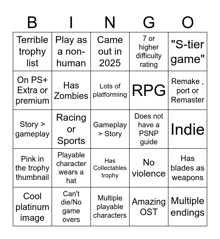 This bingo card has a free space and 24 words: Playable character wears a hat, Can't die/No game overs, Lots of platforming, Cool platinum image, "S-tier game", Terrible trophy list, On PS+ Extra or premium, Play as a non-human, Does not have a PSNP guide, Has Collectables trophy, RPG, Story > gameplay, No violence, Has blades as weapons, Has Zombies, Amazing OST, Indie, Came out in 2025, Remake , port or Remaster, Racing or Sports, Multiple endings, Pink in the trophy thumbnail, 7 or higher difficulty rating and Multiple playable characters.