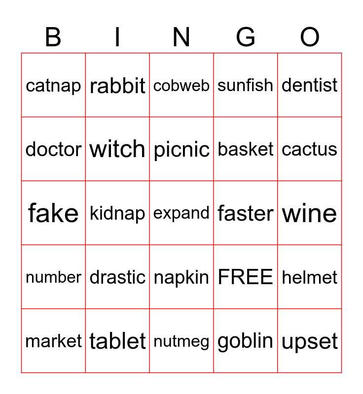 This bingo card has 25 words: drastic, nutmeg, picnic, market, dentist, catnap, doctor, rabbit, faster, napkin, basket, fake, FREE, helmet, witch, upset, wine, cobweb, cactus, kidnap, expand, tablet, number, sunfish and goblin.