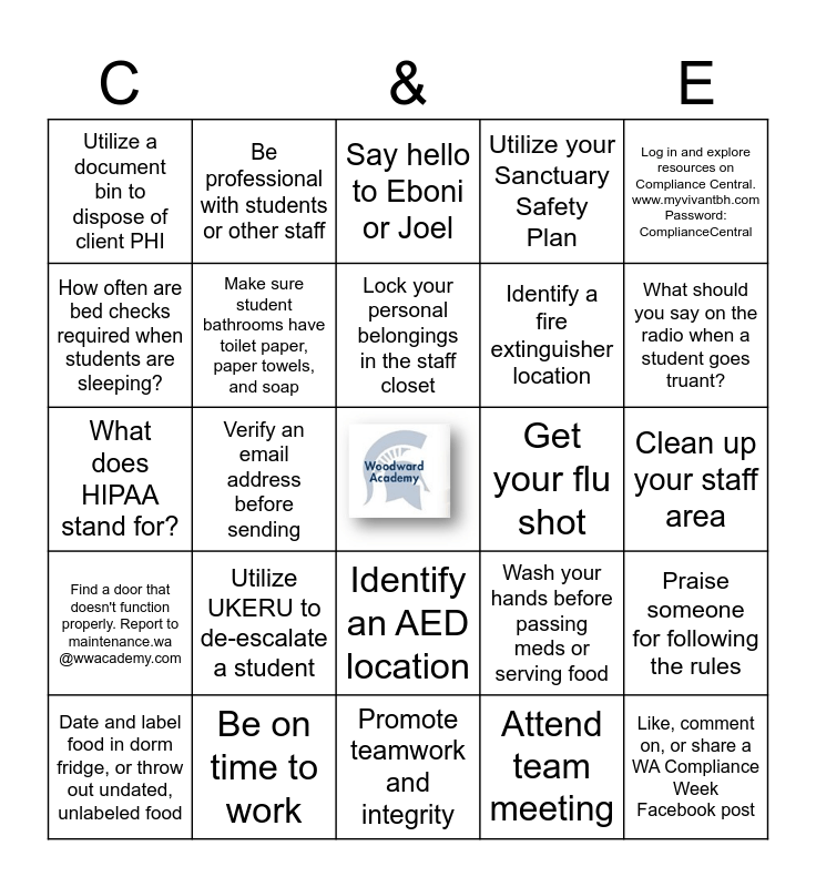 This bingo card has a free space and 24 words: Utilize UKERU to de-escalate a student, Be on time to work, Lock your personal belongings in the staff closet, Date and label food in dorm fridge, or throw out undated, unlabeled food, Log in and explore resources on Compliance Central. www.myvivantbh.com Password: ComplianceCentral, Utilize a document bin to dispose of client PHI, How often are bed checks required when students are sleeping?, Be professional with students or other staff, Get your flu shot, Identify an AED location, Identify a fire extinguisher location, What does HIPAA stand for?, Wash your hands before passing meds or serving food, Praise someone for following the rules, Make sure student bathrooms have toilet paper, paper towels, and soap, Attend team meeting, Clean up your staff area, Say hello to Eboni or Joel, What should you say on the radio when a student goes truant?, Verify an email address before sending, Like, comment on, or share a WA Compliance Week Facebook post, Find a door that doesn't function properly. Report to maintenance.wa @wwacademy.com, Utilize your Sanctuary Safety Plan and Promote teamwork and integrity.