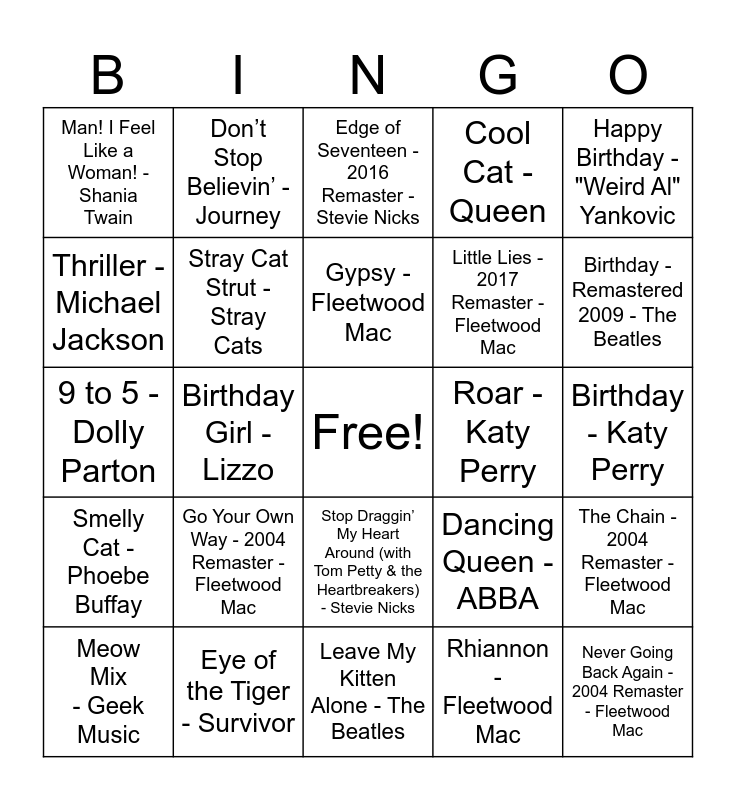 This bingo card has a free space and 42 words: Landslide - Fleetwood Mac, Gypsy - Fleetwood Mac, Dreams - Fleetwood Mac, Go Your Own Way - 2004 Remaster - Fleetwood Mac, Rhiannon - Fleetwood Mac, The Chain - 2004 Remaster - Fleetwood Mac, Never Going Back Again - 2004 Remaster - Fleetwood Mac, Crystal - 2019 Remaster - Stevie Nicks, Edge of Seventeen - 2016 Remaster - Stevie Nicks, Stop Draggin’ My Heart Around (with Tom Petty & the Heartbreakers) - Stevie Nicks, Birthday - Katy Perry, Birthday - Remastered 2009 - The Beatles, Birthday Girl - Lizzo, Happy Birthday - "Weird Al" Yankovic, There’s a Cat Licking Your Birthday Cake - Parry Gripp, Dancing Queen - ABBA, I Wanna Dance with Somebody (Who Loves Me) - Whitney Houston, 9 to 5 - Dolly Parton, Girls Just Want to Have Fun - Cyndi Lauper, Don’t Stop Believin’ - Journey, Thriller - Michael Jackson, Ghostbusters - Ray Parker Jr., Do You Believe in Magic? - The Lovin' Spoonful, Man! I Feel Like a Woman! - Shania Twain, Stayin’ Alive - Bee Gees, Harvest Moon - Neil Young, Little Lies - 2017 Remaster - Fleetwood Mac, Cat's in the Cradle - Harry Chapin, What’s New Pussycat? - Tom Jones, Phenomenal Cat - The Kinks, Ev’rybody Wants to Be a Cat - Charles Perry, Smelly Cat - Phoebe Buffay, Stray Cat Strut - Stray Cats, Leave My Kitten Alone - The Beatles, Honky Cat - Elton John, Meow Mix - Geek Music, Eye of the Tiger - Survivor, Roar - Katy Perry, Cleopatra's Cat - Spin Doctors, Nine Lives - Aerosmith, Cool Cat - Queen and The Lovecats - The Cure.
